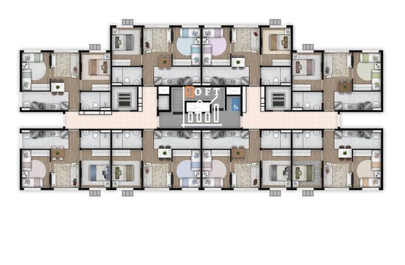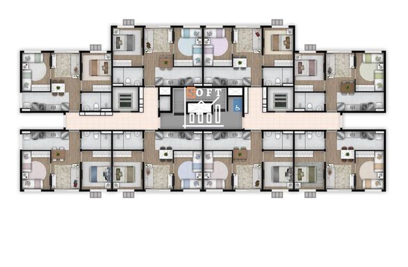 * Apartamentos de 2 quartos (46 m²) com varanda.